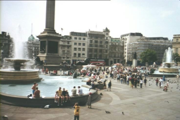 An alternate view of Trafalgar Square. The pigeons in this square more than likley outnumber the people.